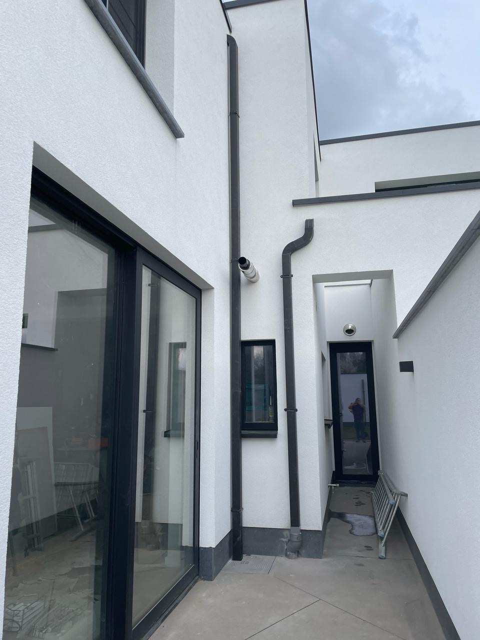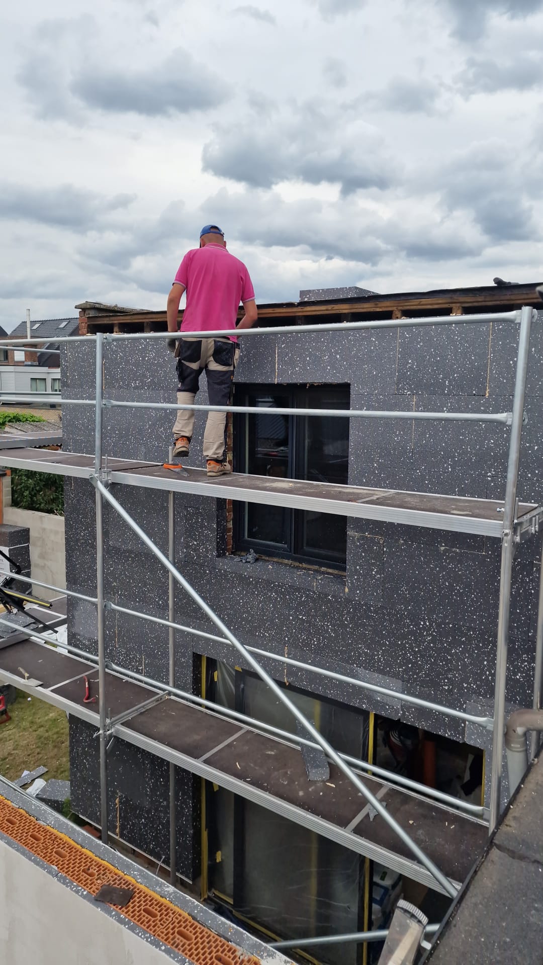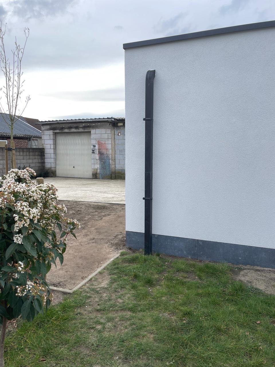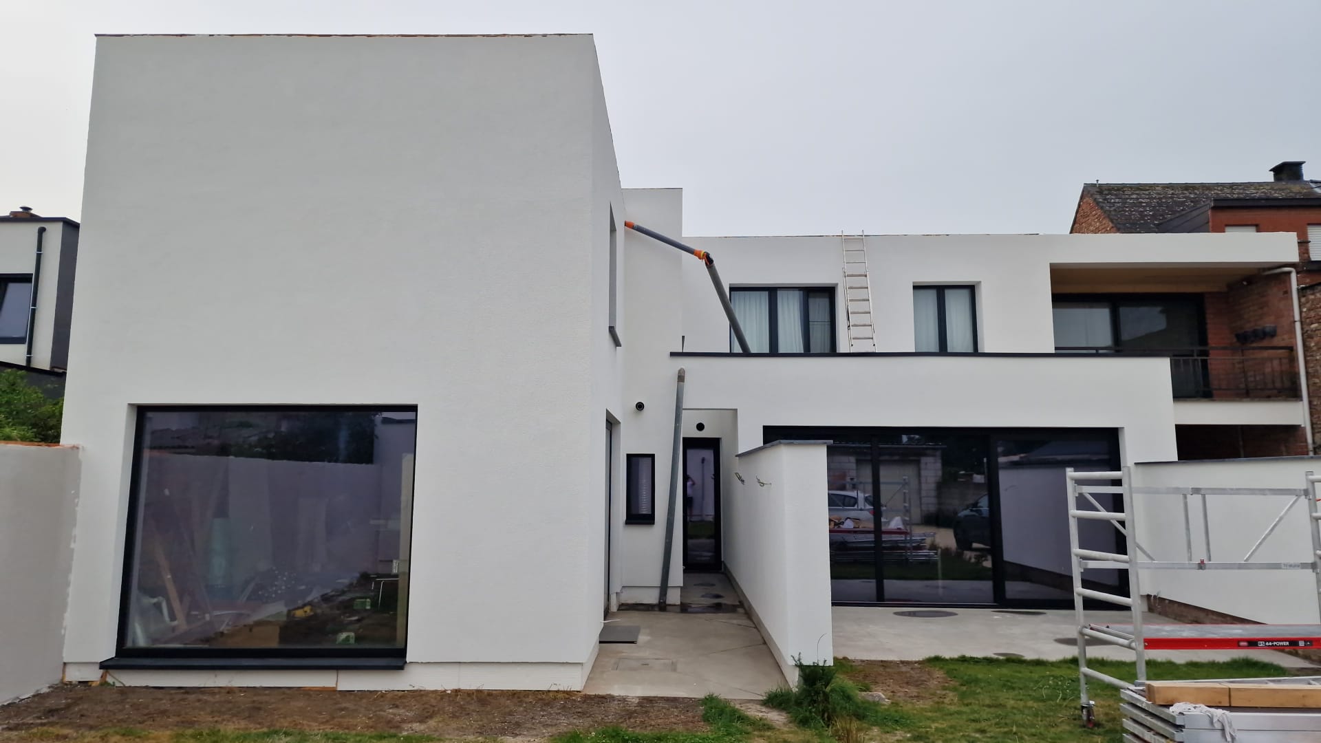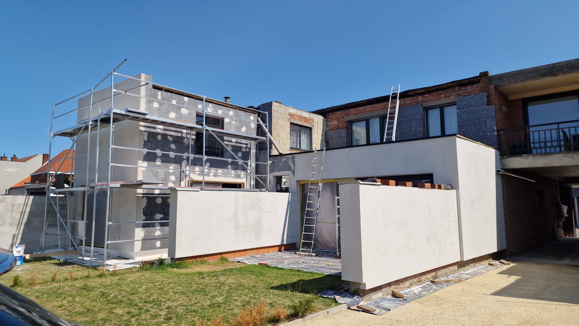 In juli 2023 hebben we een gevelrenovatie uitgevoerd. De gevel is geïsoleerd, voorbereid en afgewerkt met crepi. Voor een mooie afwerking hebben we zwarte hoekprofielen gebruikt, en aan de onderkant hebben we blauwe natuursteen toegepast.