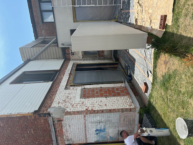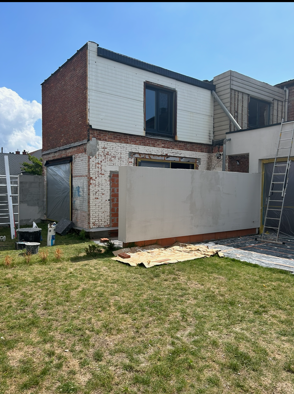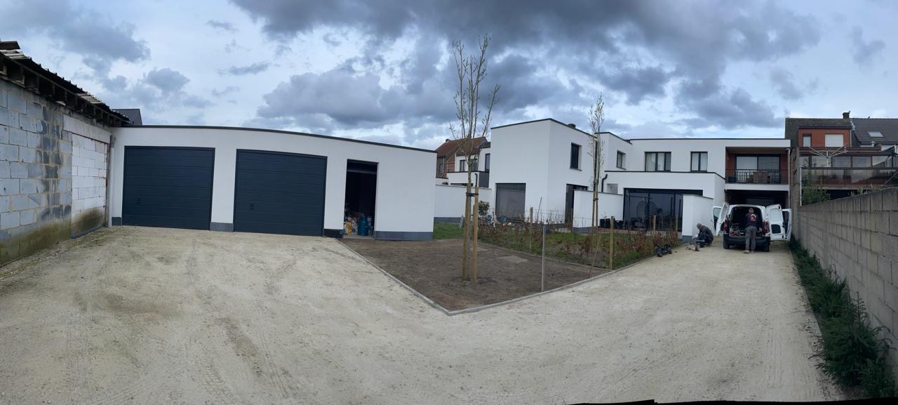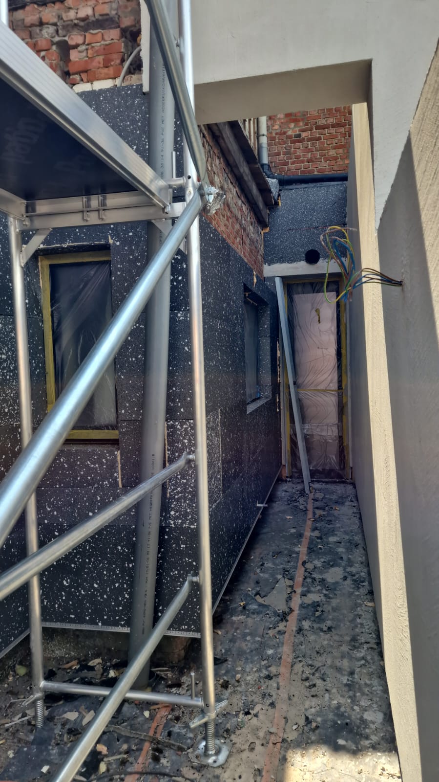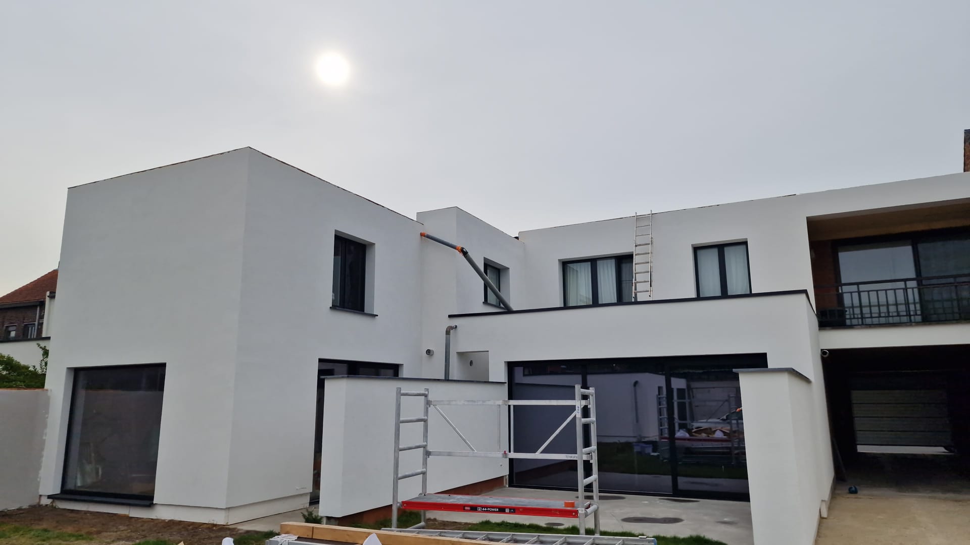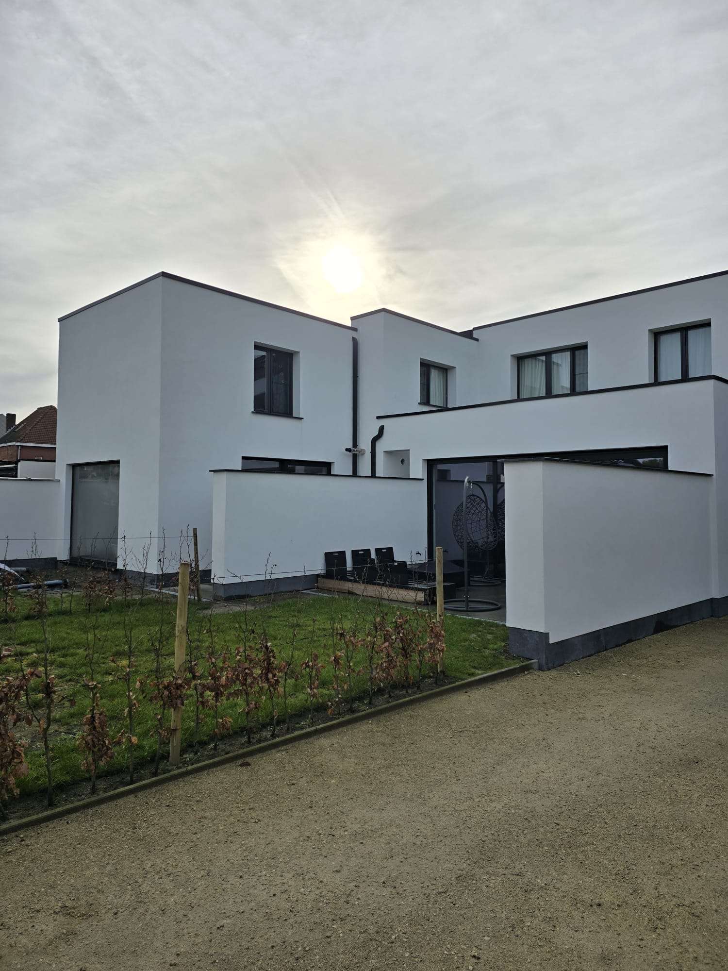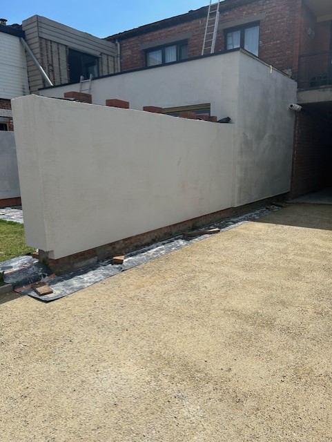 In juli 2023 hebben we een gevelrenovatie uitgevoerd. De gevel is geïsoleerd, voorbereid en afgewerkt met crepi. Voor een mooie afwerking hebben we zwarte hoekprofielen gebruikt, en aan de onderkant hebben we blauwe natuursteen toegepast.