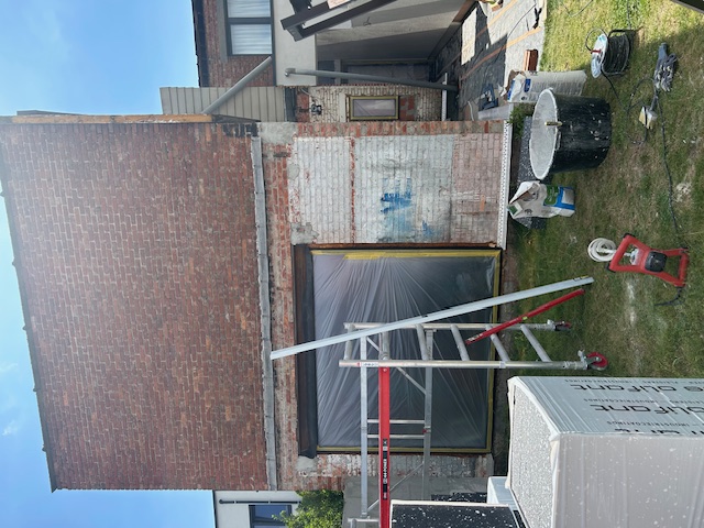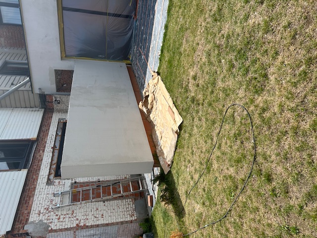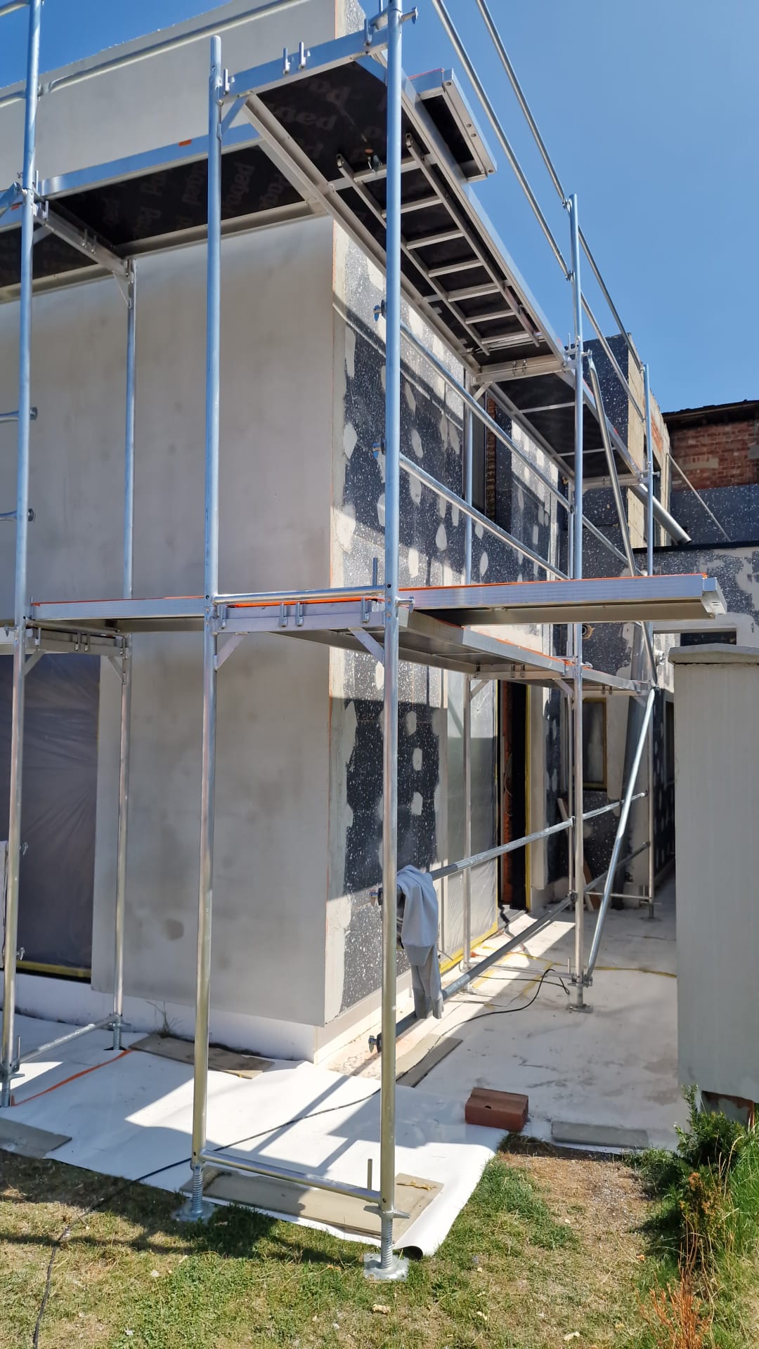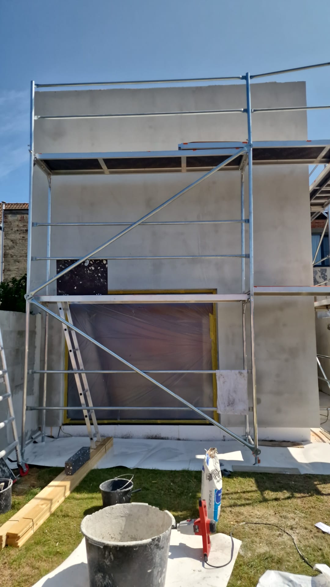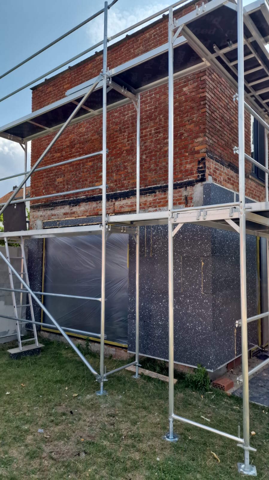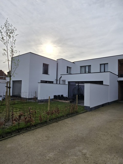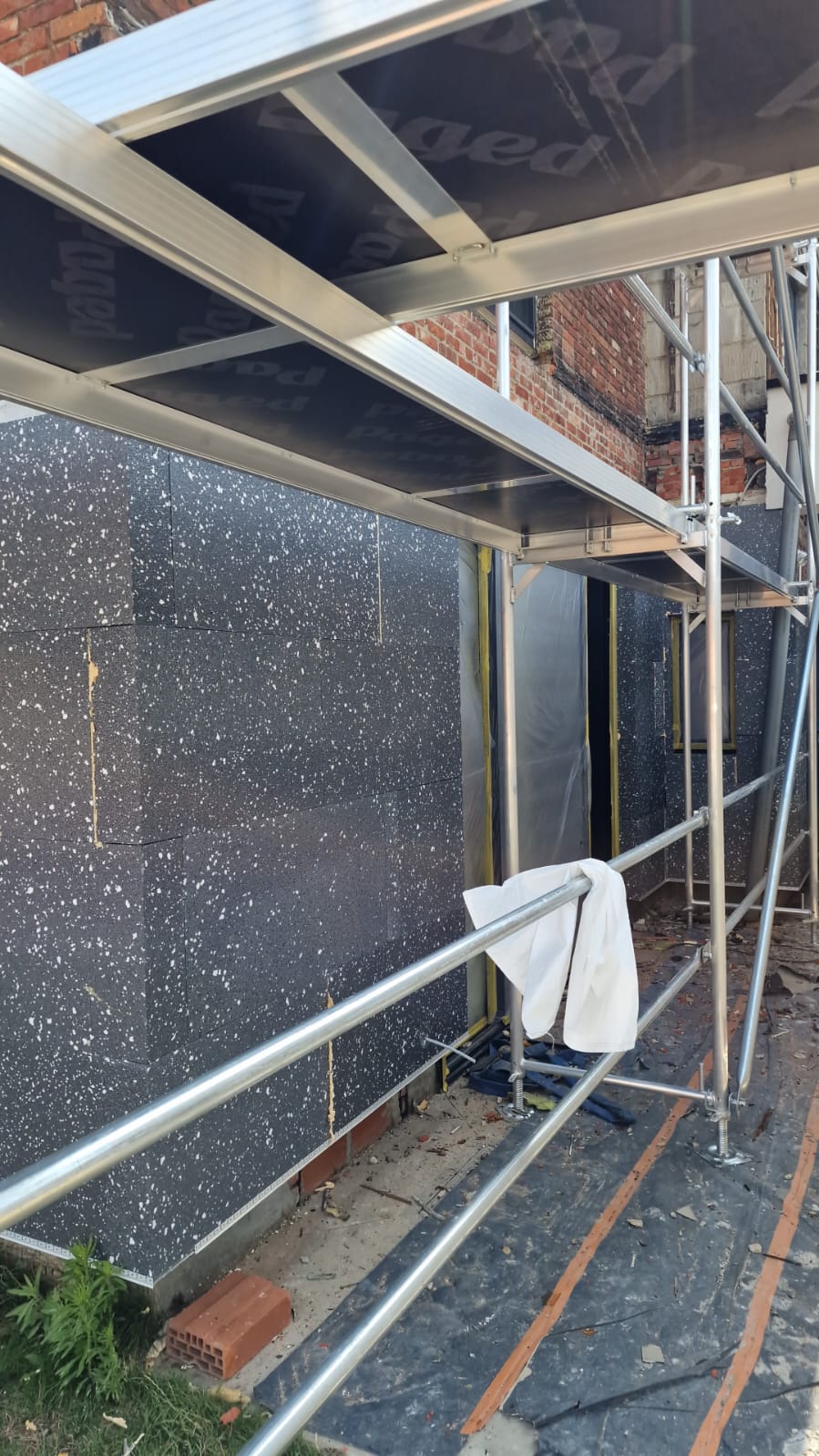 In juli 2023 hebben we een gevelrenovatie uitgevoerd. De gevel is geïsoleerd, voorbereid en afgewerkt met crepi. Voor een mooie afwerking hebben we zwarte hoekprofielen gebruikt, en aan de onderkant hebben we blauwe natuursteen toegepast.