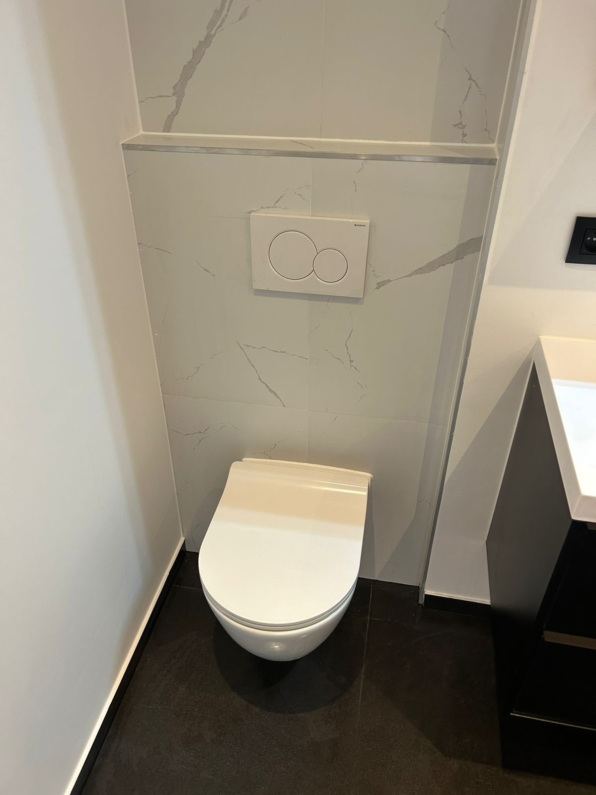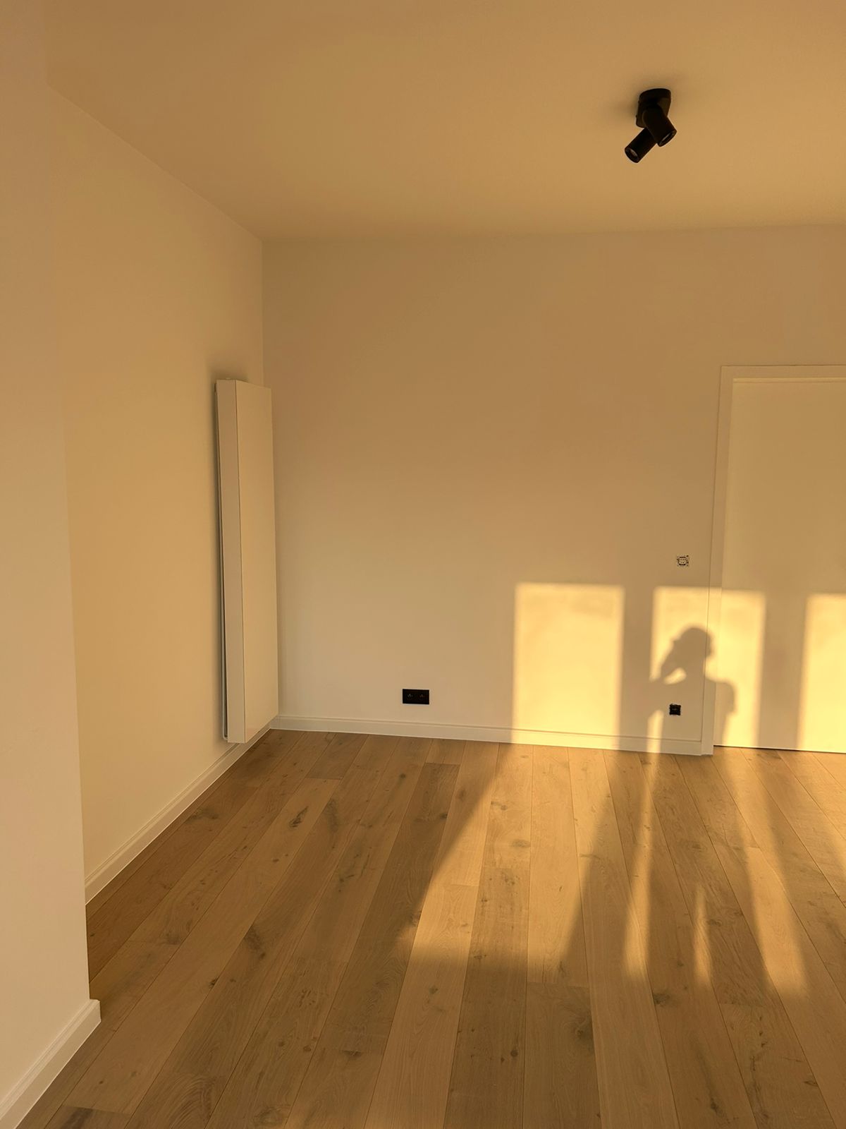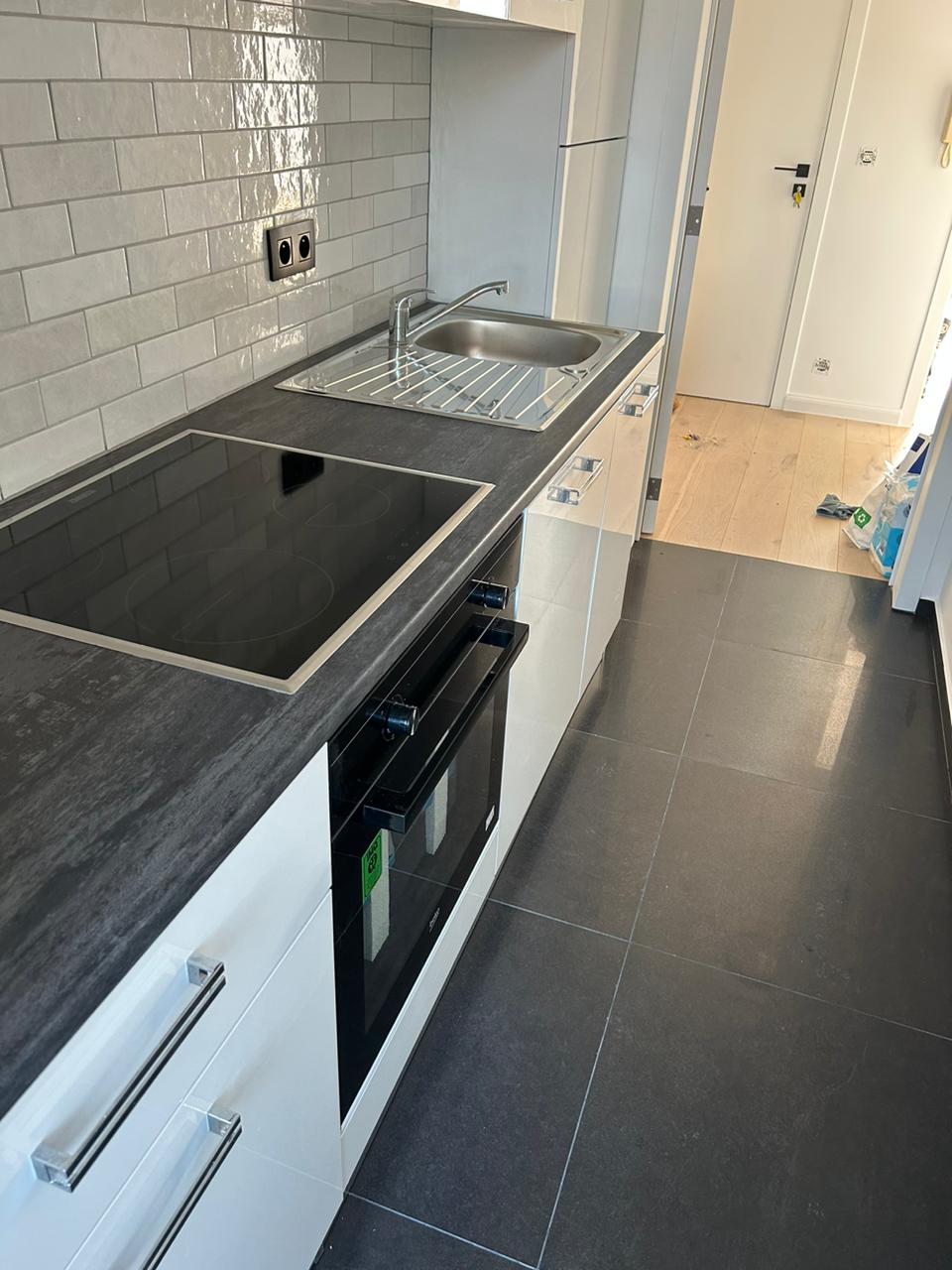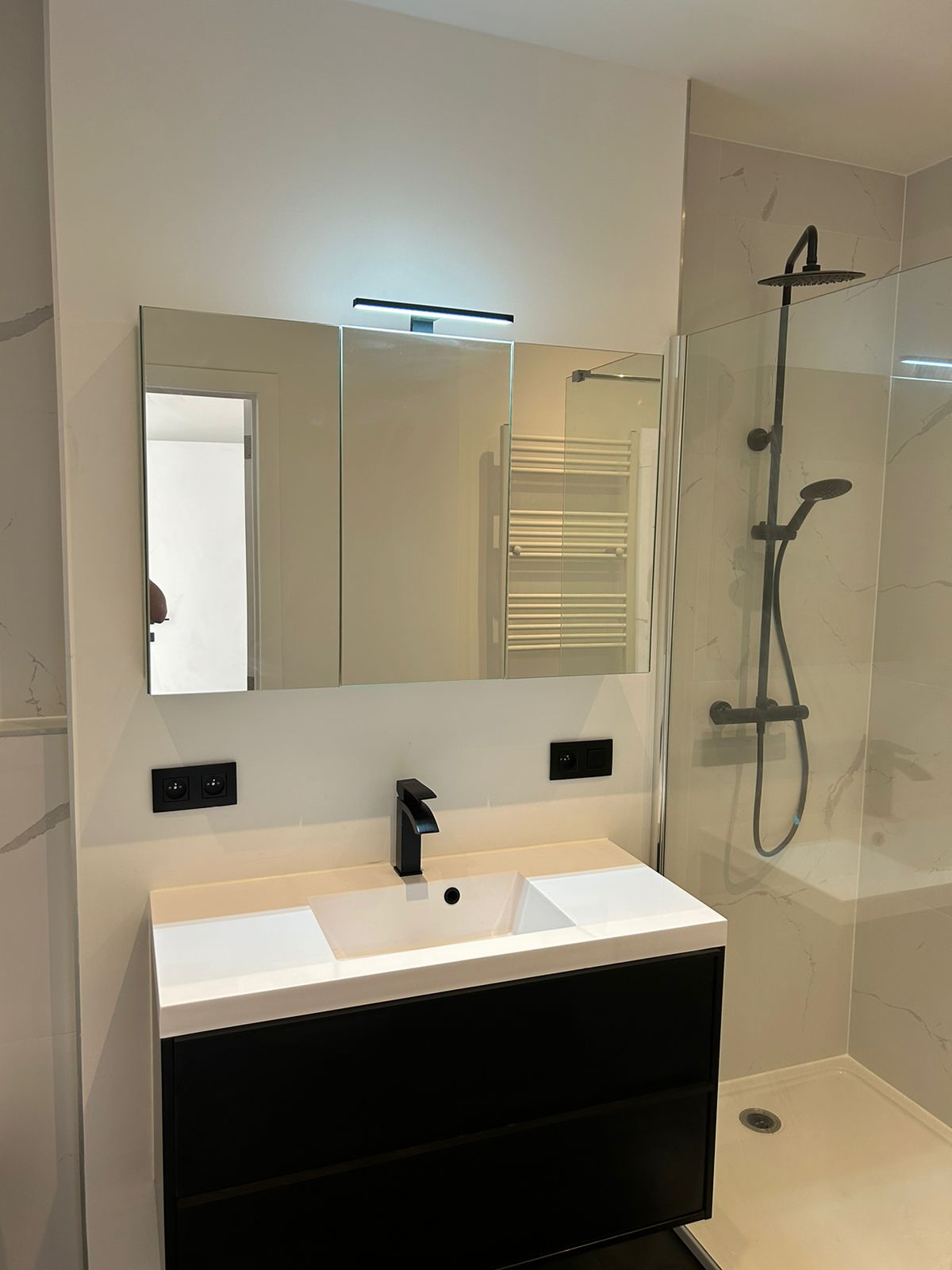 Voor het renovatieproject in Deurne, hebben we het hele appartement gestript en opnieuw opgebouwd. Nieuwe elektriciteit en sanitaire leidingen zijn geplaatst. In de woonruimte en slaapkamers is duurzaam parket gebruikt, terwijl de muren wit zijn geschilderd. De deuren zijn vernieuwd en voorzien van zwarte accessoires zoals klinken en afdekplaatjes. De badkamer is ruimer gemaakt met zwarte grote tegels, een hangtoilet met witte marmerstructuurtegels, en een enkele lavabo met één lade. Ook hebben we een spiegel met opbergplaats en marmerwitte tegels in de douche geïnstalleerd, samen met een handdoekradiator. De keuken heeft zwarte tegels en witte muren, en we hebben een basiskeuken met alle nodige attributen geplaatst.
