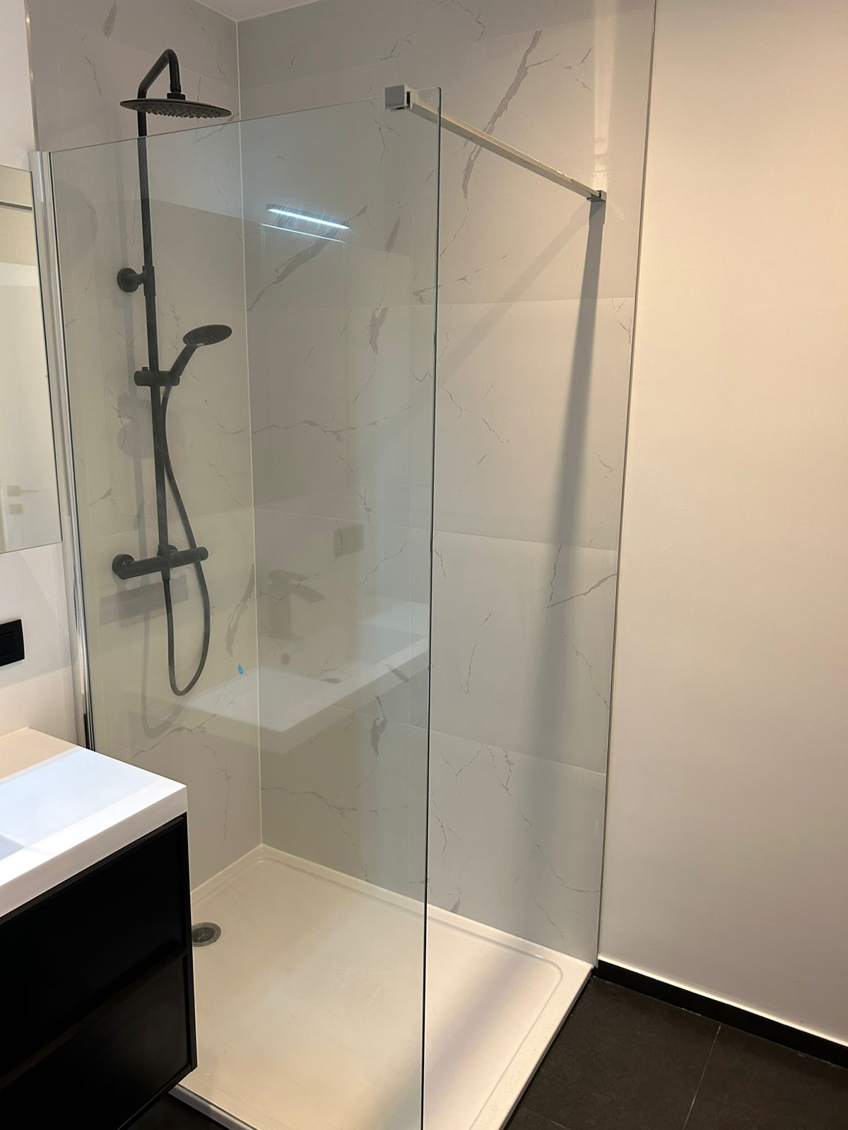 Voor het renovatieproject in Deurne, hebben we het hele appartement gestript en opnieuw opgebouwd. Nieuwe elektriciteit en sanitaire leidingen zijn geplaatst. In de woonruimte en slaapkamers is duurzaam parket gebruikt, terwijl de muren wit zijn geschilderd. De deuren zijn vernieuwd en voorzien van zwarte accessoires zoals klinken en afdekplaatjes. De badkamer is ruimer gemaakt met zwarte grote tegels, een hangtoilet met witte marmerstructuurtegels, en een enkele lavabo met één lade. Ook hebben we een spiegel met opbergplaats en marmerwitte tegels in de douche geïnstalleerd, samen met een handdoekradiator. De keuken heeft zwarte tegels en witte muren, en we hebben een basiskeuken met alle nodige attributen geplaatst.