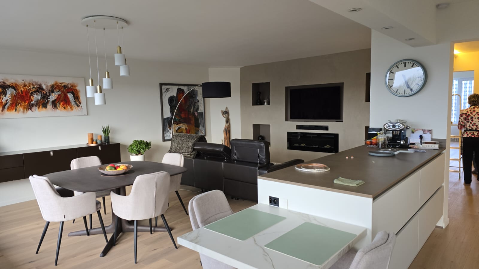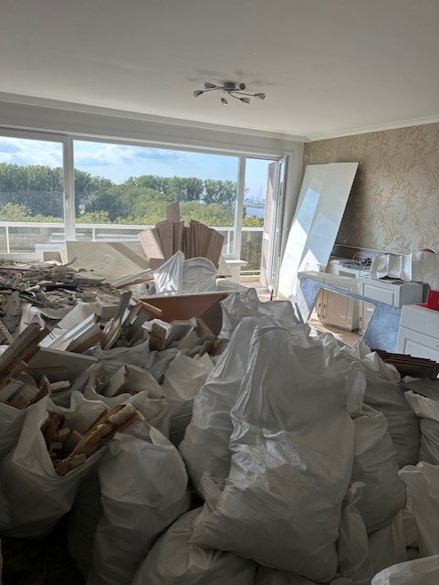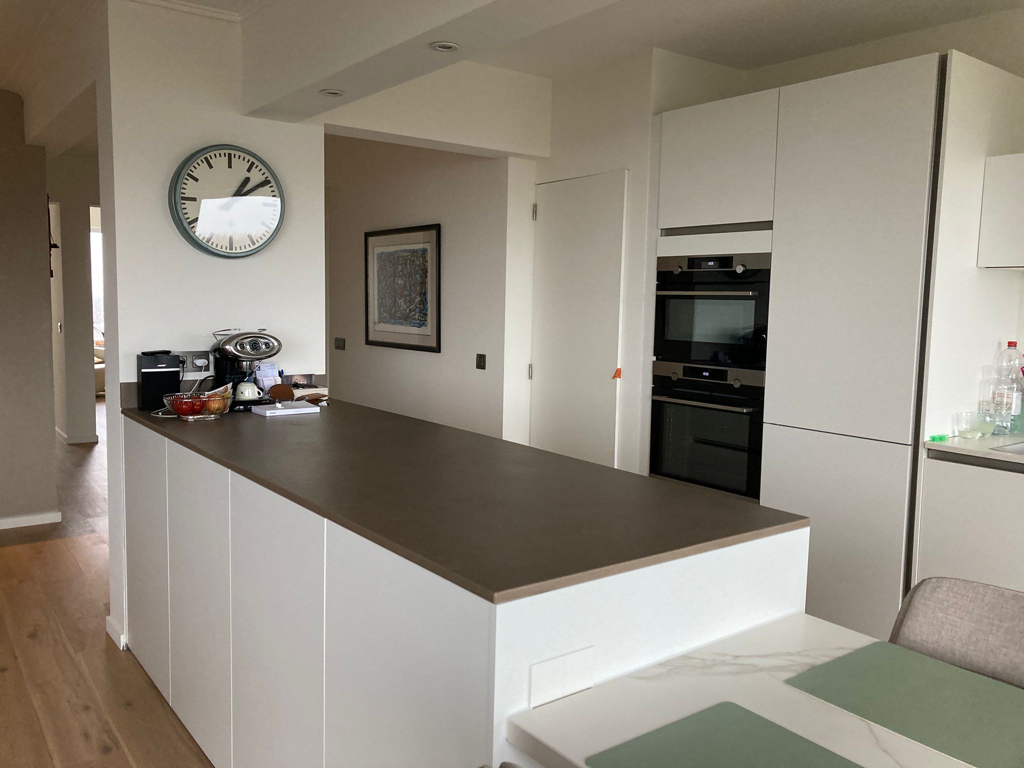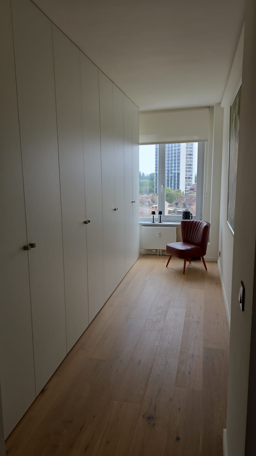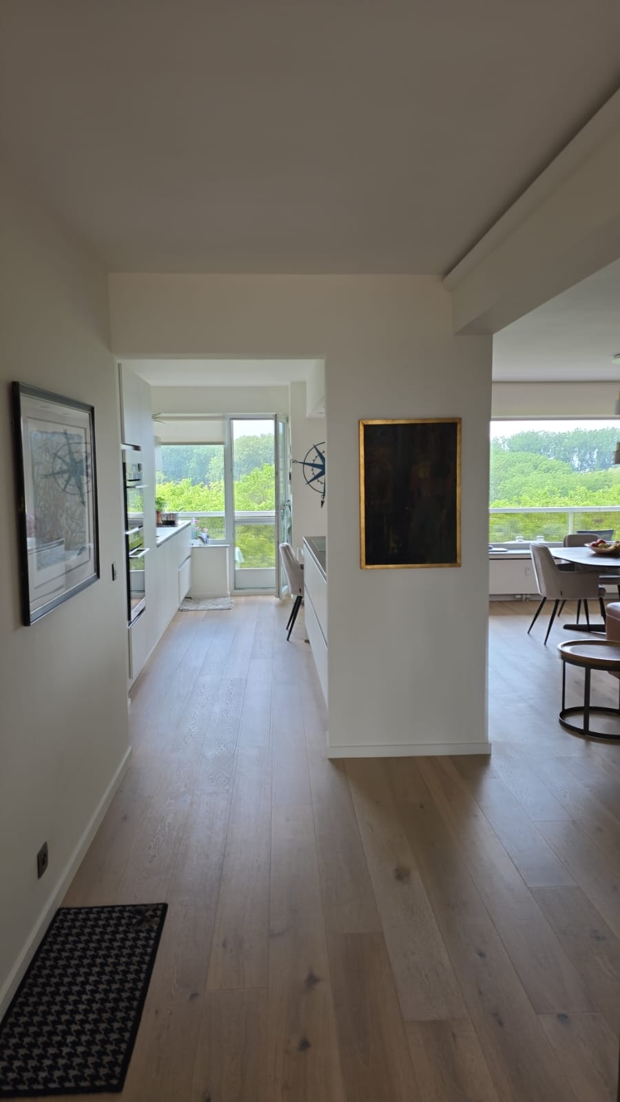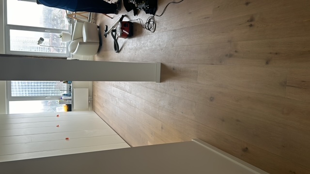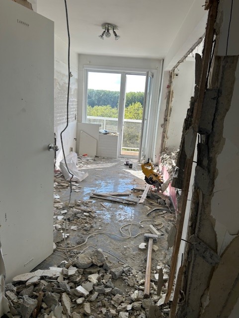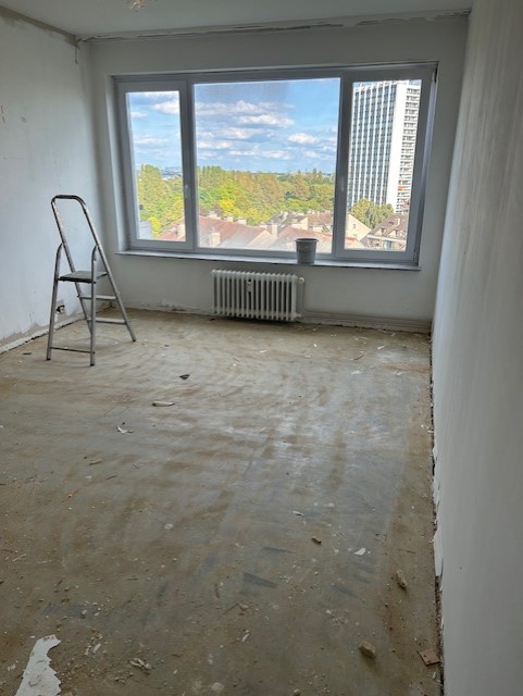 Voor het renovatieproject op Linkeroever, dat op 5 augustus 2023 begon, hebben we het hele appartement uitgebroken en gerenoveerd. De ruimte is vergroot, nieuwe elektriciteit is aangelegd, en sanitaire leidingen zijn vernieuwd. We gebruikten duurzaam parket met houtstructuur en stucbeton voor de tv-wand. De slaapkamers zijn wit geschilderd en hebben parketvloeren. In de badkamer hebben we de douche betegeld met dunne, lange steentjes in lichtgrijs, een glazen douchewand geplaatst en lichtbronzen sanitairaccessoires gebruikt. Zowel de douche als de lavabo hebben kranen en een dubbele lavabo met tweedelige opbergschuiven, allemaal in witte kleur.