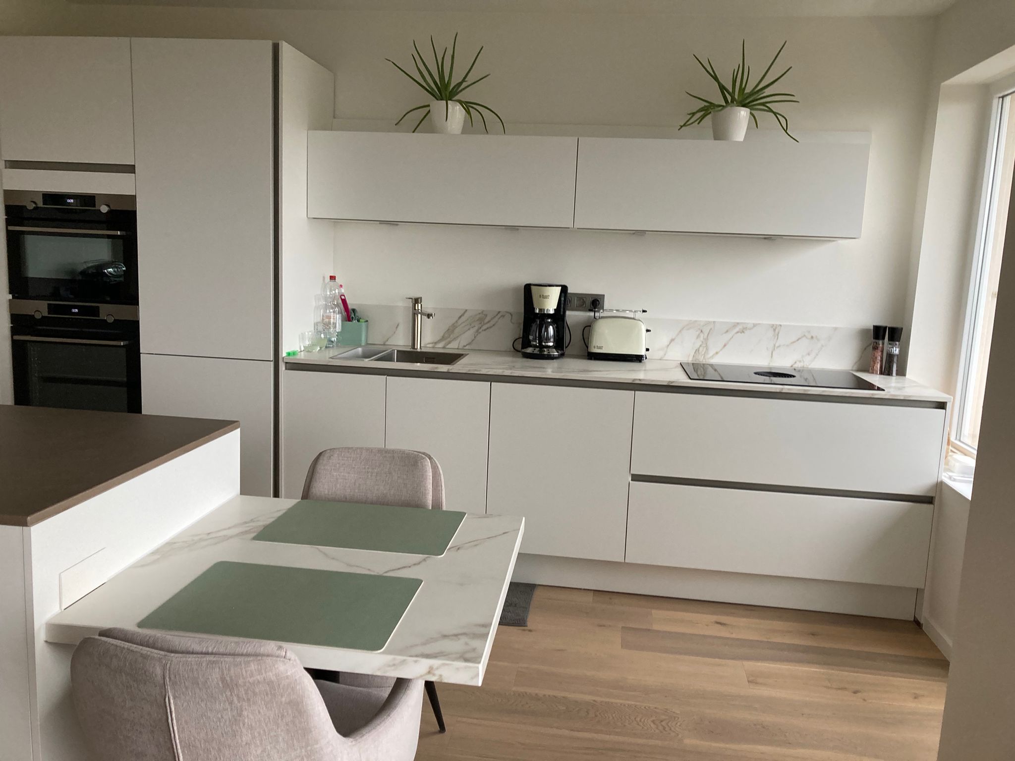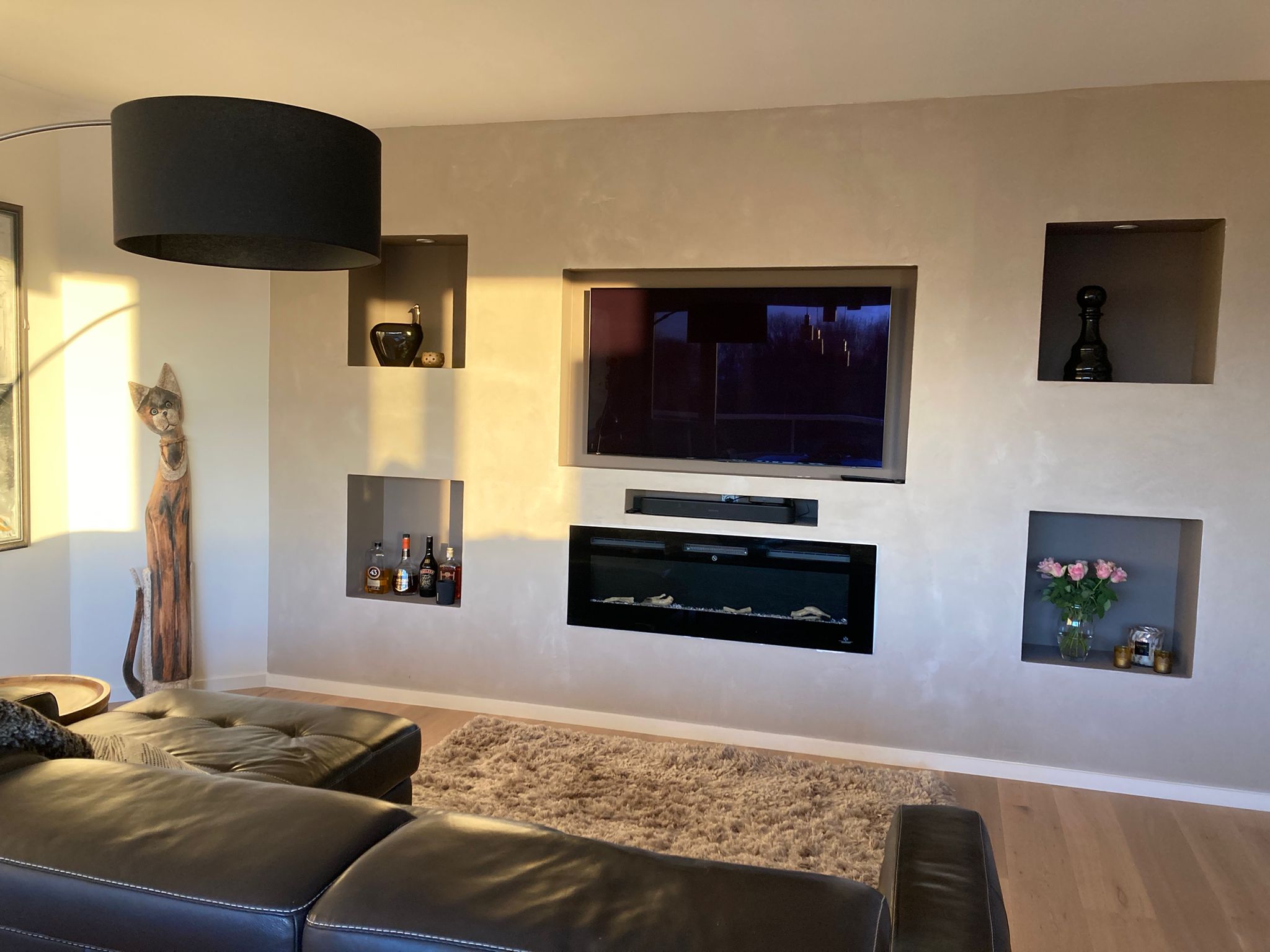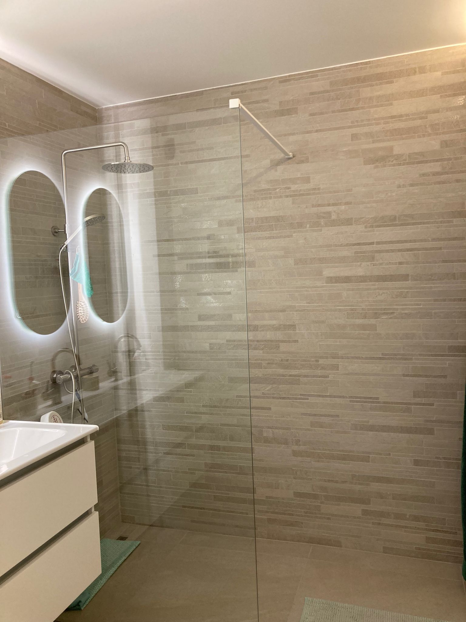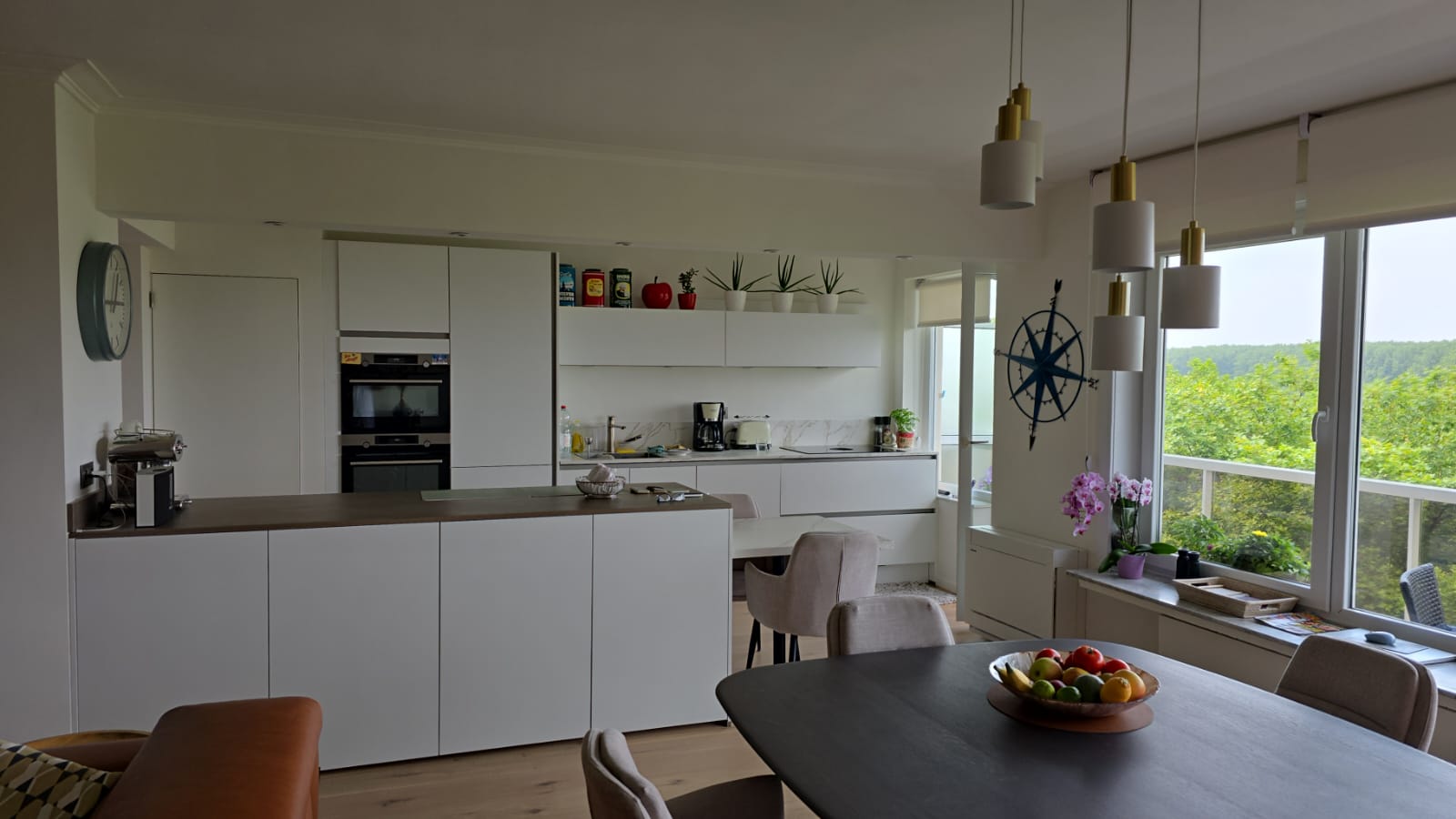Voor het renovatieproject op Linkeroever, dat op 5 augustus 2023 begon, hebben we het hele appartement uitgebroken en gerenoveerd. De ruimte is vergroot, nieuwe elektriciteit is aangelegd, en sanitaire leidingen zijn vernieuwd. We gebruikten duurzaam parket met houtstructuur en stucbeton voor de tv-wand. De slaapkamers zijn wit geschilderd en hebben parketvloeren. In de badkamer hebben we de douche betegeld met dunne, lange steentjes in lichtgrijs, een glazen douchewand geplaatst en lichtbronzen sanitairaccessoires gebruikt. Zowel de douche als de lavabo hebben kranen en een dubbele lavabo met tweedelige opbergschuiven, allemaal in witte kleur.